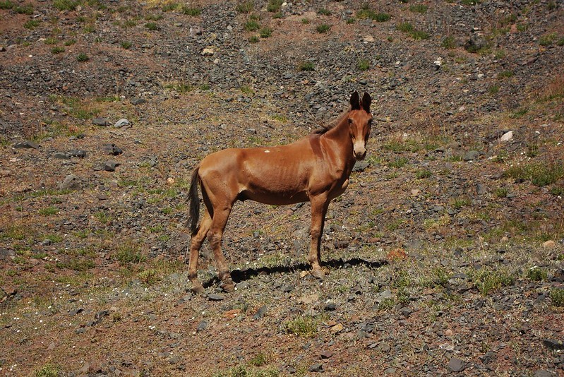 On the same trip, on the day of my birthday I was just walking on the beautiful landscape that surrounds the Aconcagua mountain, just walking to see the giant closer. Like a birthday gift. Just going by the old train rails I found a mule sitting there. I went closer and he stood up, one of his legs was apparently broken. In that kind of animals that means he's going to die, no cure for broken bones. Probably his owner left him there. And there was I, alone again with an animal that "needed help". I noticed the same pattern and didn't know what to do. Tried to get closer but the mule started moving, afraid of hurting it I left.