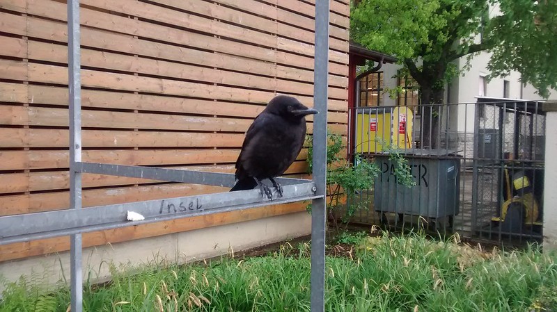 Few months later, I was walking on Basel (Switzerland), towards France. Just close to the "border", there was a tree-lined square with a huge amount of ravens flying and trilling above me. I was really impressed by the noise of that birds, just a little bit before. There was a lonely raven, standing on a metal structure. Alone, ill-looking, I just stared at it. I came closer, he opened his wings but one of them described a weird angle when closed. Something was broken. The illness was stronger than the self-awareness or pride, I just went close enough to touch him and tried to feed him. Didn't work.